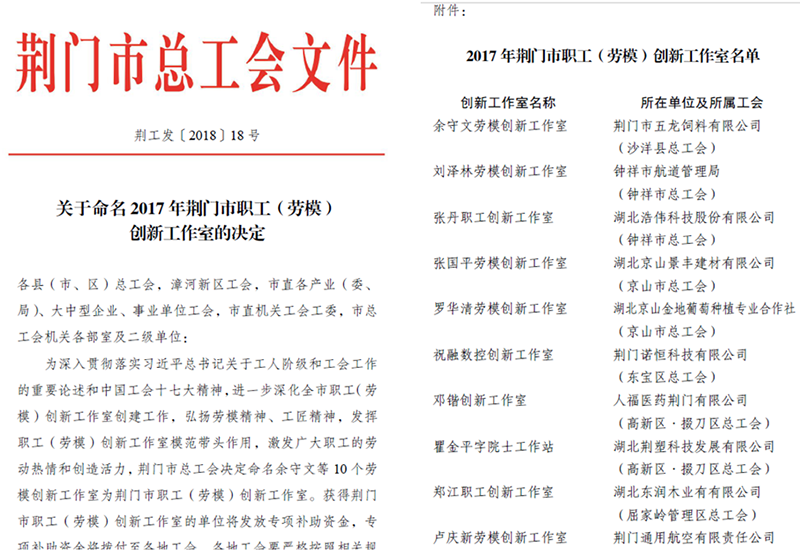 2018年11月,荊門市總工會對公司“盧慶新勞模創(chuàng)新工作室”進行考核驗收,對“盧慶新勞模創(chuàng)新工作室”在技術(shù)攻關(guān)、人員培養(yǎng)等方面起到的示范帶頭作用給予了充分肯定。